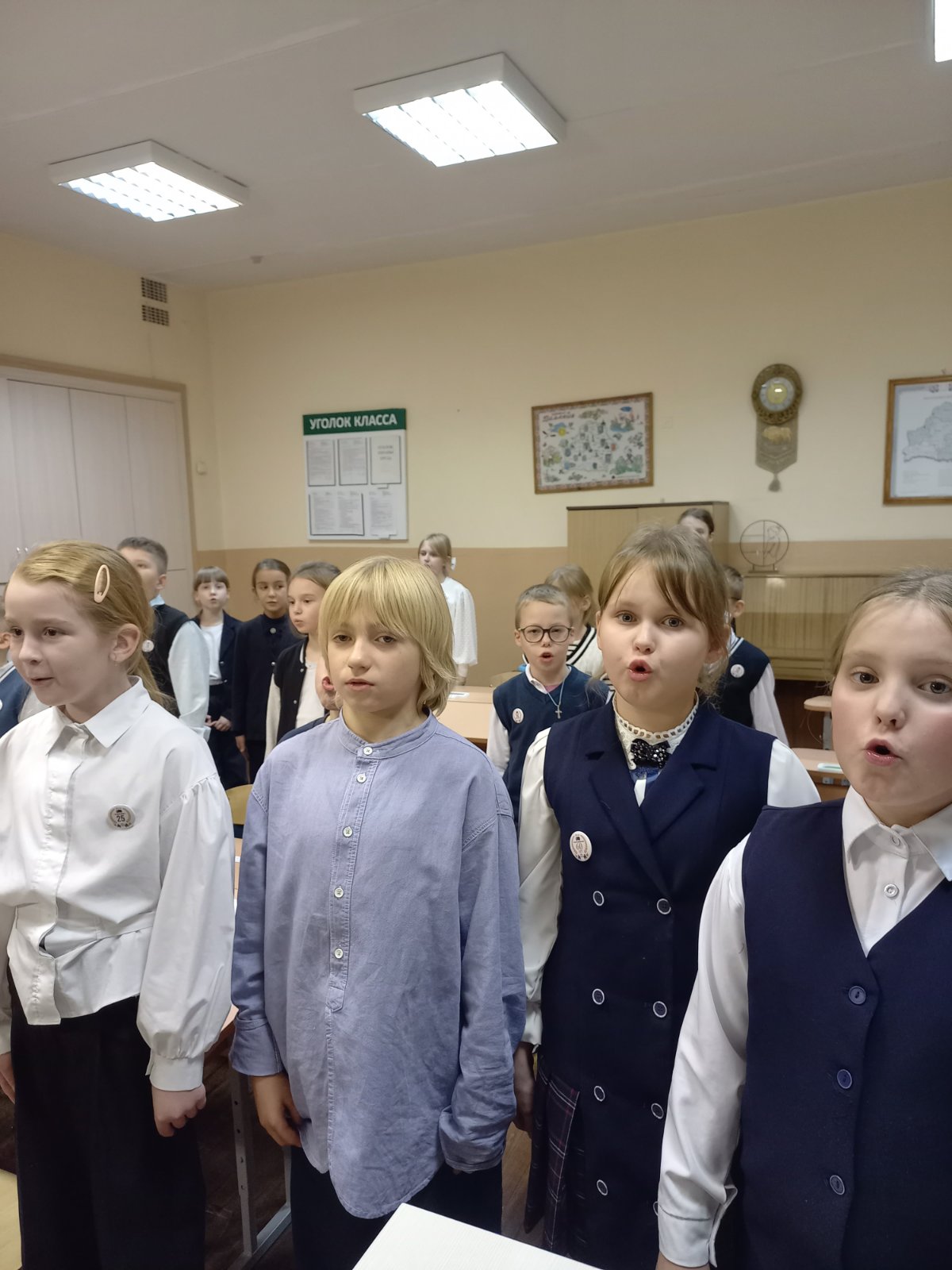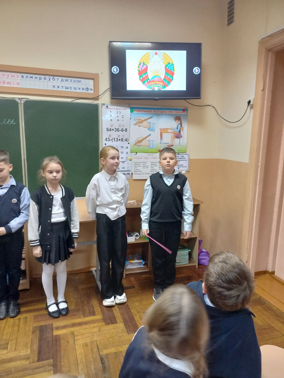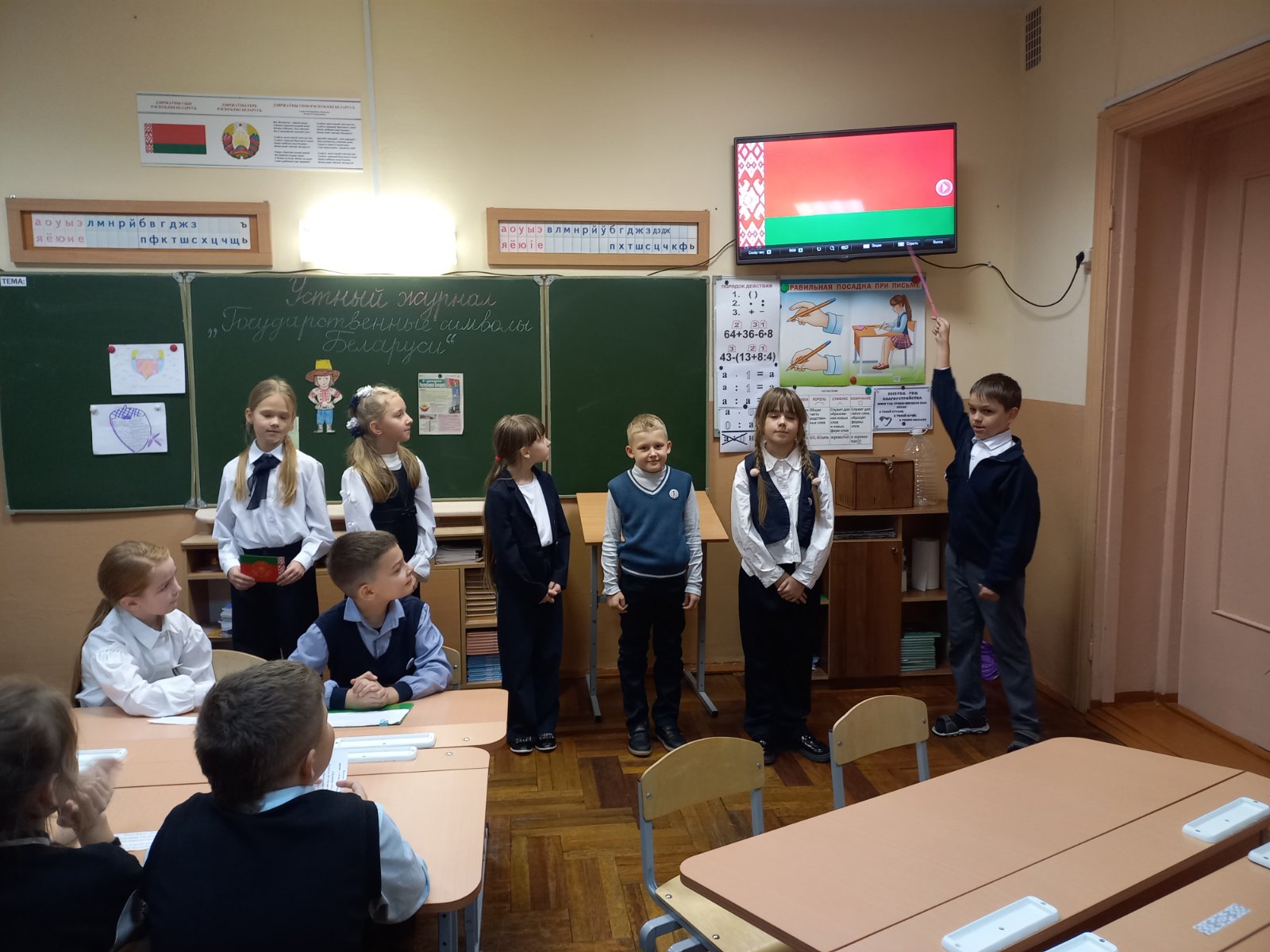 17 ноября учащиеся 3″А” класса во время классного часа подробно знакомились с государственными символами Беларуси. Классный час проходил в виде устного журнала. Каждая микрогруппа представляла свою страничку: “Государственный флаг Республики Беларусь”, “Государственный герб Республики Беларусь”, “Государственный гимн Республики Бедарусь”. На четвертой странице устного журнала “Знатоки” учащиеся отвечали на вопросы и выполняли задания викторины о государственных символах нашей страны.