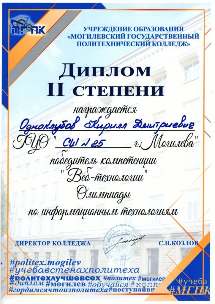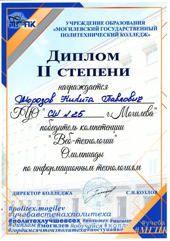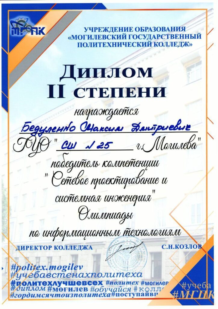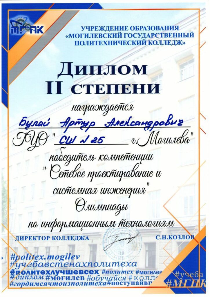 🔹️27.01.2026 на базе учреждения образования «Могилевский государственный политехнический колледж» состоялась олимпиада по информационным технологиям среди учащихся учреждений общего среднего образования г. Могилева.🔹️ ПОБЕДИТЕЛЯМИ олимпиады стали: – в номинации “Сетевое проектирование и системная инженерия” БЕДУЛЕНКО Максим (9 «В») и БУЛАЙ Артур (9 «А»); – в номинации “Веб-технологии” МОРОЗОВ Никита (9 «В») и ОДНОКЛУБОВ Кирилл (10 «А»). Победители олимпиады будут проходить подготовку к областному этапу олимпиады по информационным технологиям. Руководители команды, учителя информатики МАКАРЕНКО Ирина Владимировна, КАРПЕЧИНА Мария Михайловна.
