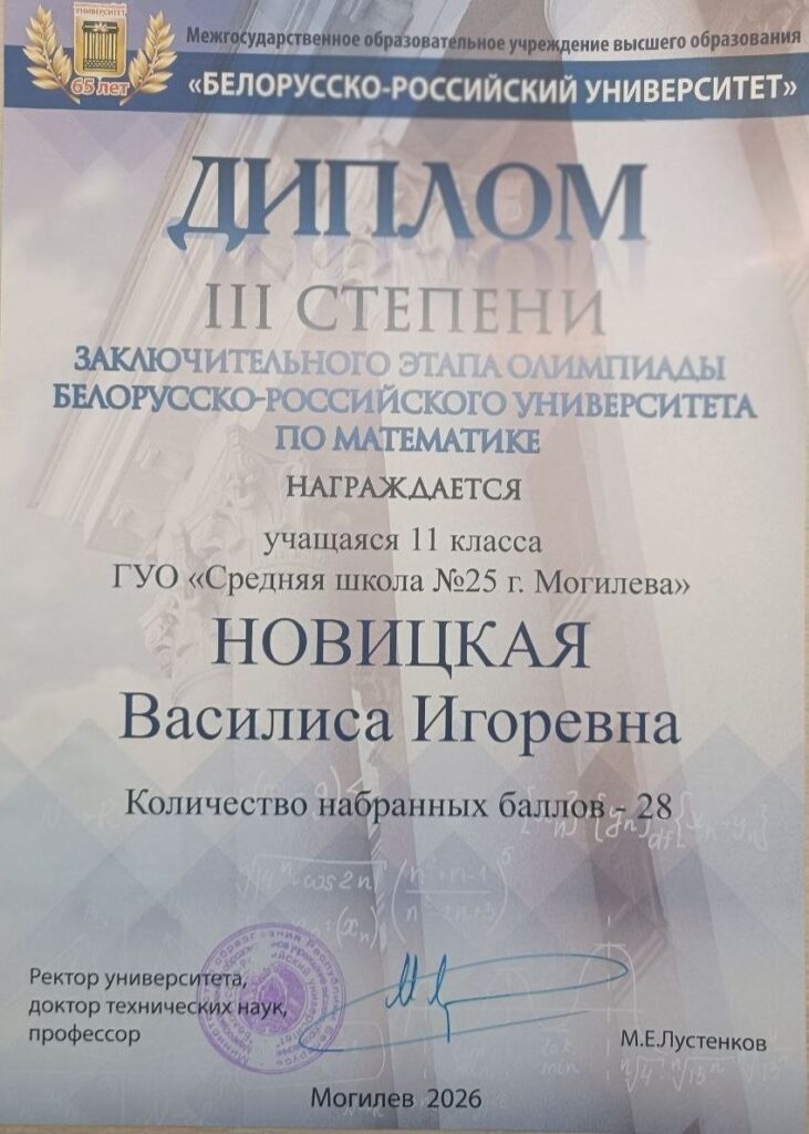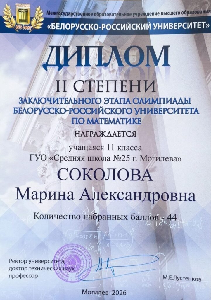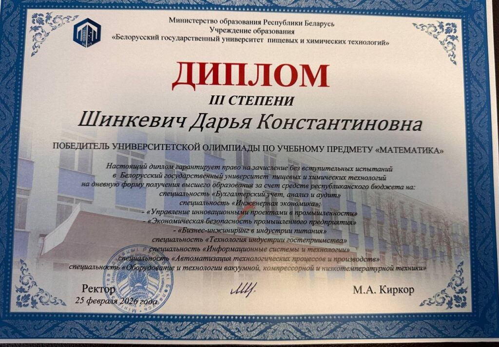 В феврале 2026 года учащиеся 11 классов учреждения образования приняли участие в университетских олимпиадах по математике Белорусско-Российского университета, Белорусского государственного университета пищевых и химических технологий; по биологии Витебского государственного ордена Дружбы народов медицинского университета.