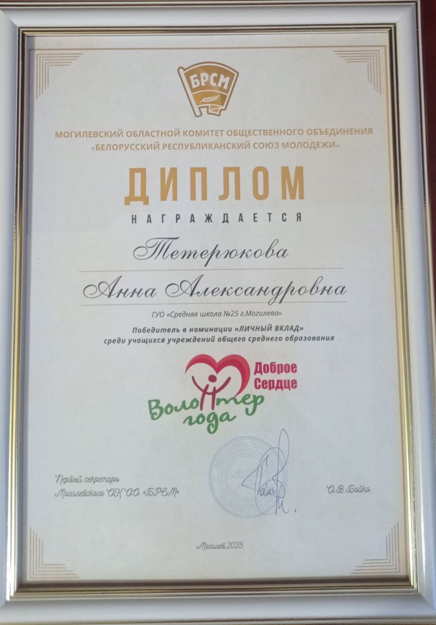 25 ноября 2025 года учащаяся 9 «Б» класса Тетерюкова Анна награждена дипломом победителя и ценным подарком за работу по реализации волонтерского проекта «Эхо войны – Могилевщина помнит!» Проект посвящен Году благоустройства страны и 80-летию Победы в Великой Отечественной войне.